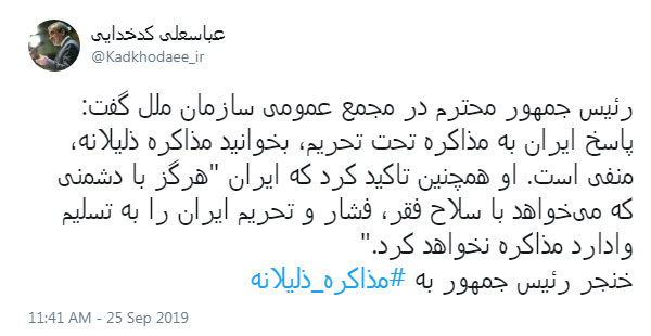 « رئیس جمهور محترم در مجمع عمومی سازمان ملل گفت: پاسخ ایران به مذاکره تحت تحریم، بخوانید مذاکره ذلیلانه، منفی است. او همچنین تاکید کرد که ایران "هرگز با دشمنی که میخواهد با سلاح فقر، فشار و تحریم ایران را به تسلیم وادارد مذاکره نخواهد کرد. "