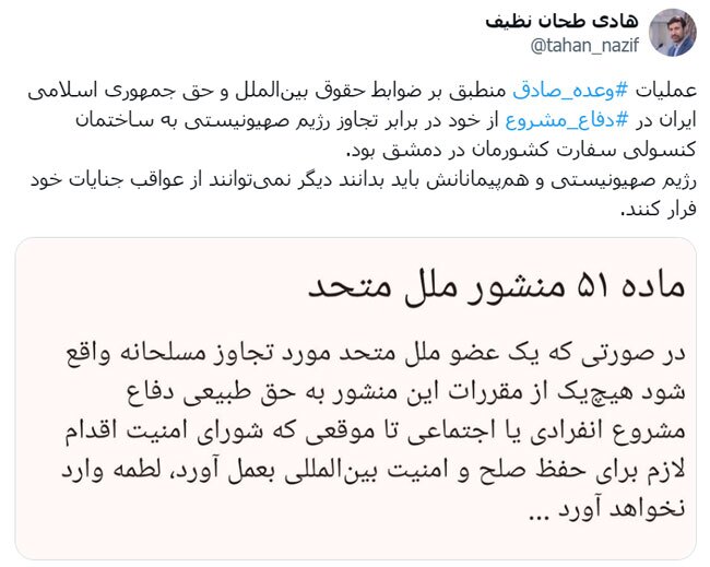 عملیات وعده صادق منطبق بر ضوابط حقوق بینالملل و حق جمهوری اسلامی ایران در دفاع مشروع از خود در برابر تجاوز رژیم صهیونیستی به ساختمان کنسولی سفارت کشورمان در دمشق بود.